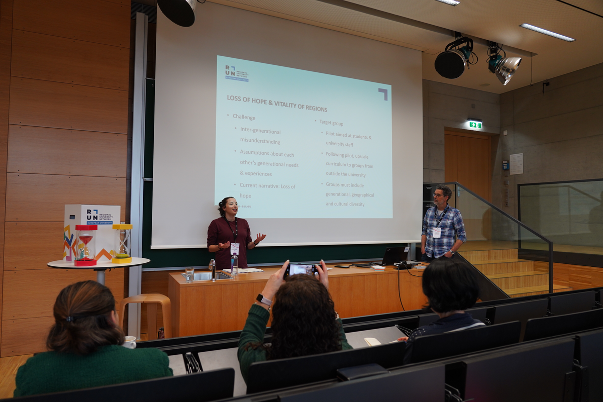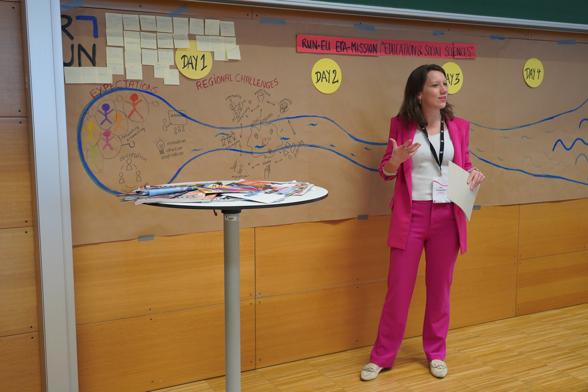 29.04.2024In heterogeneous small groups, the participants analysed the challenges they share in their RUN-EU regions and the skills needed to tackle them. Based on these findings, the participants developed concrete proposals for joint learning opportunities in the areas of "Vital regions and future perspectives", "Wellbeing & mental health", "Community & sense of belonging", "Ethical use of Artificial Intelligence" and "Celebration of diversity".