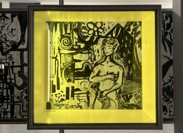 The painted panels were first designed on the floor, then hung along the window façade of the B wing of the FHV and illuminated. In addition, the text passages used were projected onto the wall.