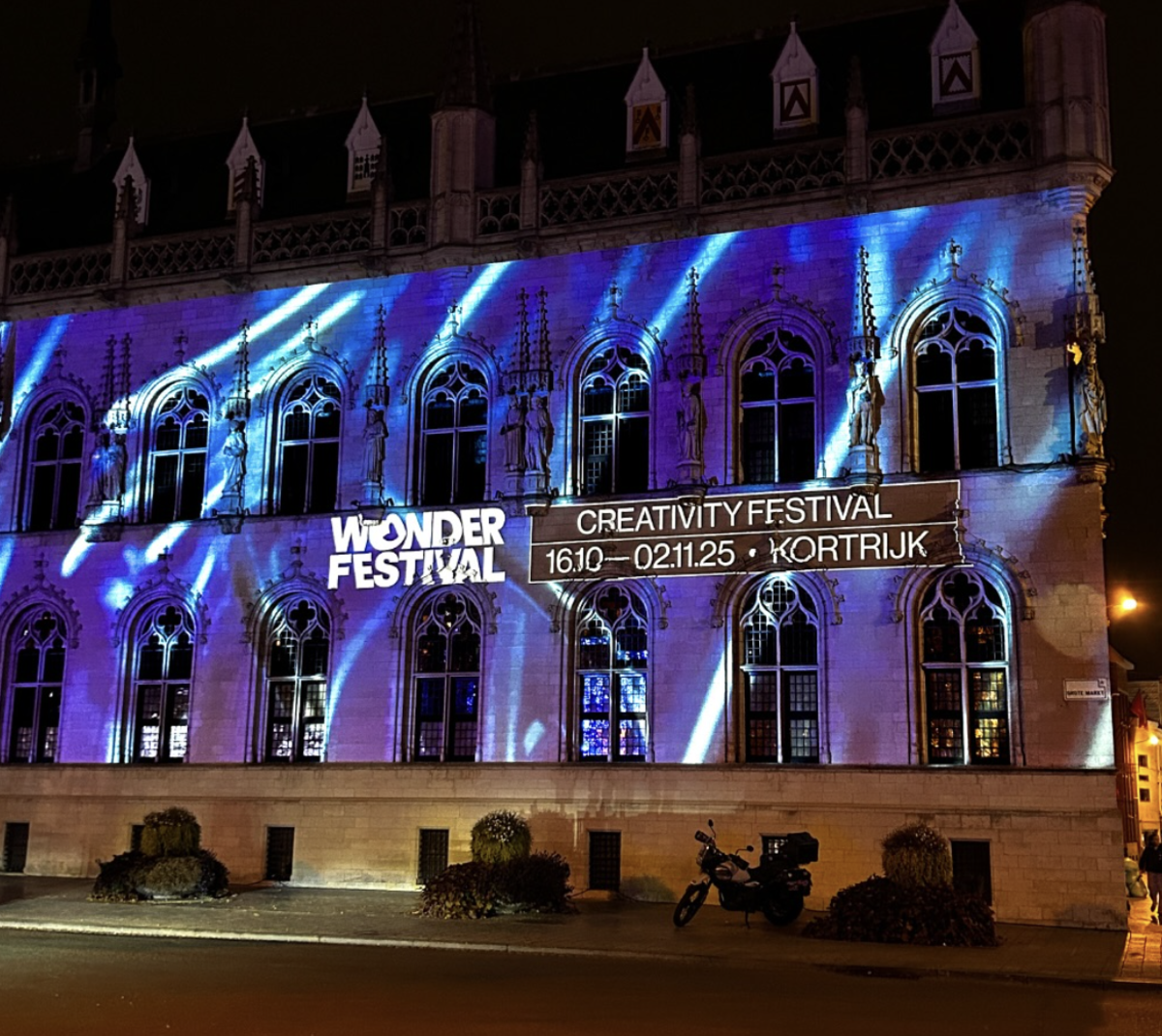 As part of the ‘International Cooperation Project’ specialisation, seven students worked together with students from Howest University in Kortrijk to develop visual projections for the WONDER Creativity Festival. The works were projected onto the façade of the historic town hall, bringing design in public spaces to life.