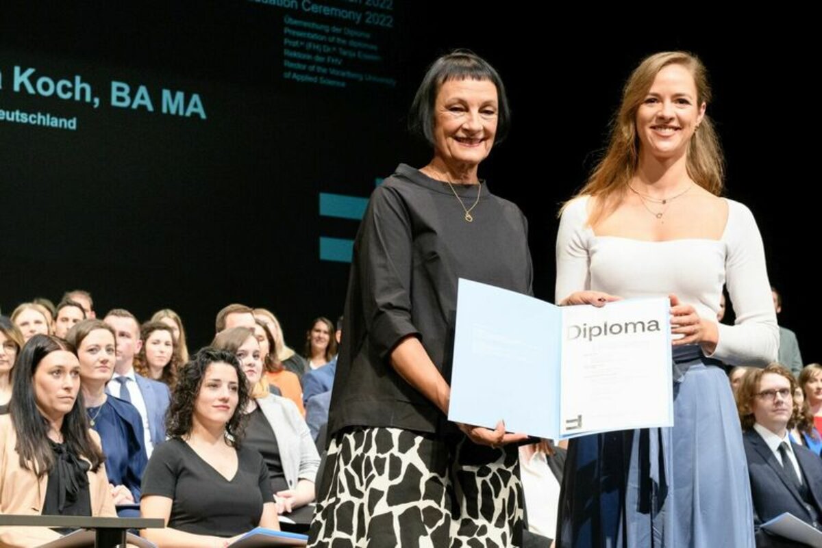 22.10.2022Während für 552 Erstsemestrige das Studium an der FHV kürzlich begonnen hatte, feierten 336 Bachelor- und 158 Masterstudierende am Freitag und Samstag ihre Sponsion. An diesen zwei Tagen stand das Kulturhaus Dornbirn somit ganz im Zeichen von erfolgreichen Abschlüssen und Auszeichnungen. In vier Festakten erhielten 494 Absolvent:innen von insgesamt 24 Bachelor- und Masterstudiengängen aus den Fachbereichen Wirtschaft, Technik, Gestaltung sowie Soziales und Gesundheit ihre Urkunden von FH-Rektorin Tanja Eiselen. „Das Studium der diesjährigen Absolvent:innen war begleitet von vielen Herausforderungen: Corona und Distance Learning, der immer deutlicher spürbare Klimawandel, die Energiekrise und ein Krieg mitten in Europa. Ich wünsche mir, dass sie diese Herausforderungen annehmen und mit ihren im Studium erworbenen Kompetenzen alles dazu beitragen, Lösungen dafür zu generieren“, hob Eiselen hervor.