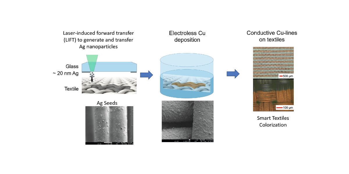 08.05.2023Eine große technologische Herausforderung besteht jedoch in der Erzeugung stabiler Leiterbahnstrukturen auf den flexiblen Oberflächen. Im Rahmen des FFG Projekts „ConCoTex“ (Microsized Conductive lines and structural Coloration on Textiles) werden dafür neue Herstellungsprozesse erforscht. Die Rolle des Forschungszentrum Mikrotechnik der FHV ist es neue laserbasierte Verfahren zu entwickeln. Dabei wird das LIFT-Verfahren („laser-induced forward transfer“) dazu verwendet, um aus einer dünnen Silberschicht Nanopartikel zu generieren und diese auf Textilien zu übertragen (Sieh Bild links). Beim Research Institute of Textile Chemistry and Textile Physics der Universität Innsbruck werden darauf anschließend mittels „electroless copper deposition“ leitende Kupferbahnen erzeugt. Durch die Kombination beider Verfahren können Leiterbahnen quasi direkt geschrieben werden, was für die Entwicklung von Prototypen von Vorteil ist.
