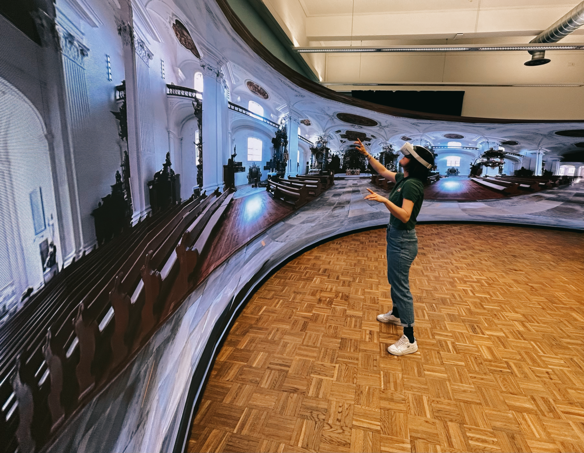 Die Wallfahrtskirche im deutschen Birnau, die Abteikirche von Ebersmünster im Elsass oder die Kirchen der Klöster St. Gallen und Einsiedeln in der Schweiz – die „Auer Zunft“ aus dem Bregenzerwald errichtete im 17. und 18. Jahrhundert 800 Barockbauten im Bodenseeraum. Der Rundgang zu den Bregenzerwälder Barockbaumeistern kann aufgrund der großen Entfernungen ausschließlich im digitalen Raum erlebt werden. Muss aber nicht, denn auch hier verbindet sich die physische mit der digitalen Welt. Sie können mit einer Virtual Reality Brille eine barocke Kathedrale betreten werden und dabei erleben, wie sich die Lichtstimmung im Innenraum von Sonnenaufgang bis zur Nacht verändert. Ein 360-Grad-Video macht’s möglich.
