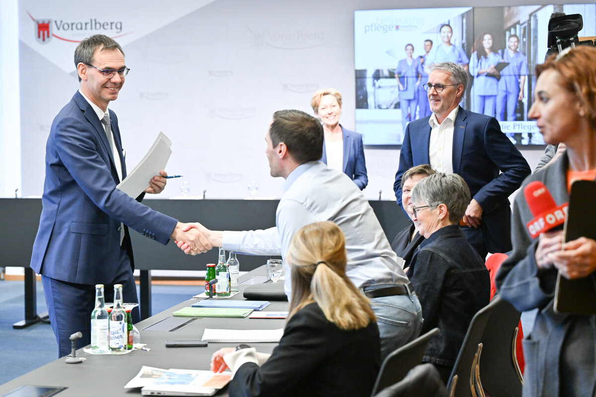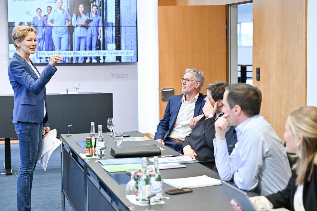 Von der FHV war Diana Brodda, unter anderem Studiengangsleiterin und Leitung Kompetenzfeld Gesundheits- und Krankenpflege (GKP), im Landhaus vor Ort. Sie blickte im Pressefoyer auf den erfolgreichen akademischen Weg zurück und stellte das neue Bachelor-Upgrade-Programm sowie den Nostrifizierungslehrgang für Personen aus Drittstaaten vor. „Ein Alleinstellungsmerkmal des GKP-Studiums an der FHV ist die enge Verknüpfung von Theorie und Praxis“, betonte sie. Bereits seit 2018 bietet die FHV das Bachelorstudium Gesundheits- und Krankenpflege an. Die Verknüpfung von wissenschaftlichen, fachlichen und persönlichkeitsbildenden Kompetenzen zeichnet das Hochschulstudium aus. Zusätzlich zum akademischen Abschluss erhalten die AbsolventInnen die Berufsberechtigung für den gehobenen Dienst in der Gesundheits- und Krankenpflege. „Seit dem Start des Gesundheits- und Krankenpflegestudiums an unserer Hochschule haben sich die Studierendenzahlen kontinuierlich gesteigert. Aktuell sind 183 Studierende in der Gesundheit- und Krankenpflege eingeschrieben. Mit Unterstützung der Vorarlberger Landesregierung konnten wir die Studienplätze ausbauen und verfolgen das gemeinsame Ziel, noch mehr Menschen für das Pflegestudium zu gewinnen und dringend benötigte Pflegefachkräfte für den gehobenen Dienst auszubilden“, erklärt FHV-Geschäftsführer Stefan Fitz-Rankl.