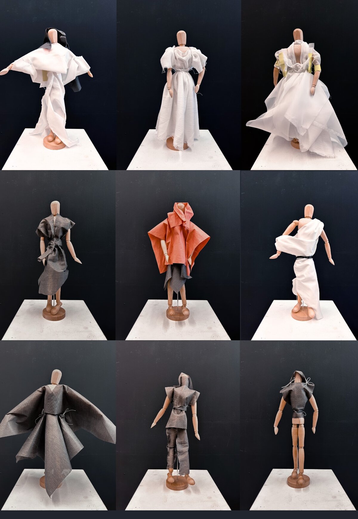 Der Start erfolgte mit einem Workshop im Rahmen des Vertiefungsfachs Eco-Design. Nach einem Input von Studiengangsleiterin Anna Huoviala zu nachhaltigem Design im Bereich der Mode, arbeiteten die Studierenden im Rahmen eines dreistündigen Designsprints an einer eigenen Kollektion. Die Modelle sollten den Prinzipien der Modularität oder auch Zero Waste folgend gestaltet werden.