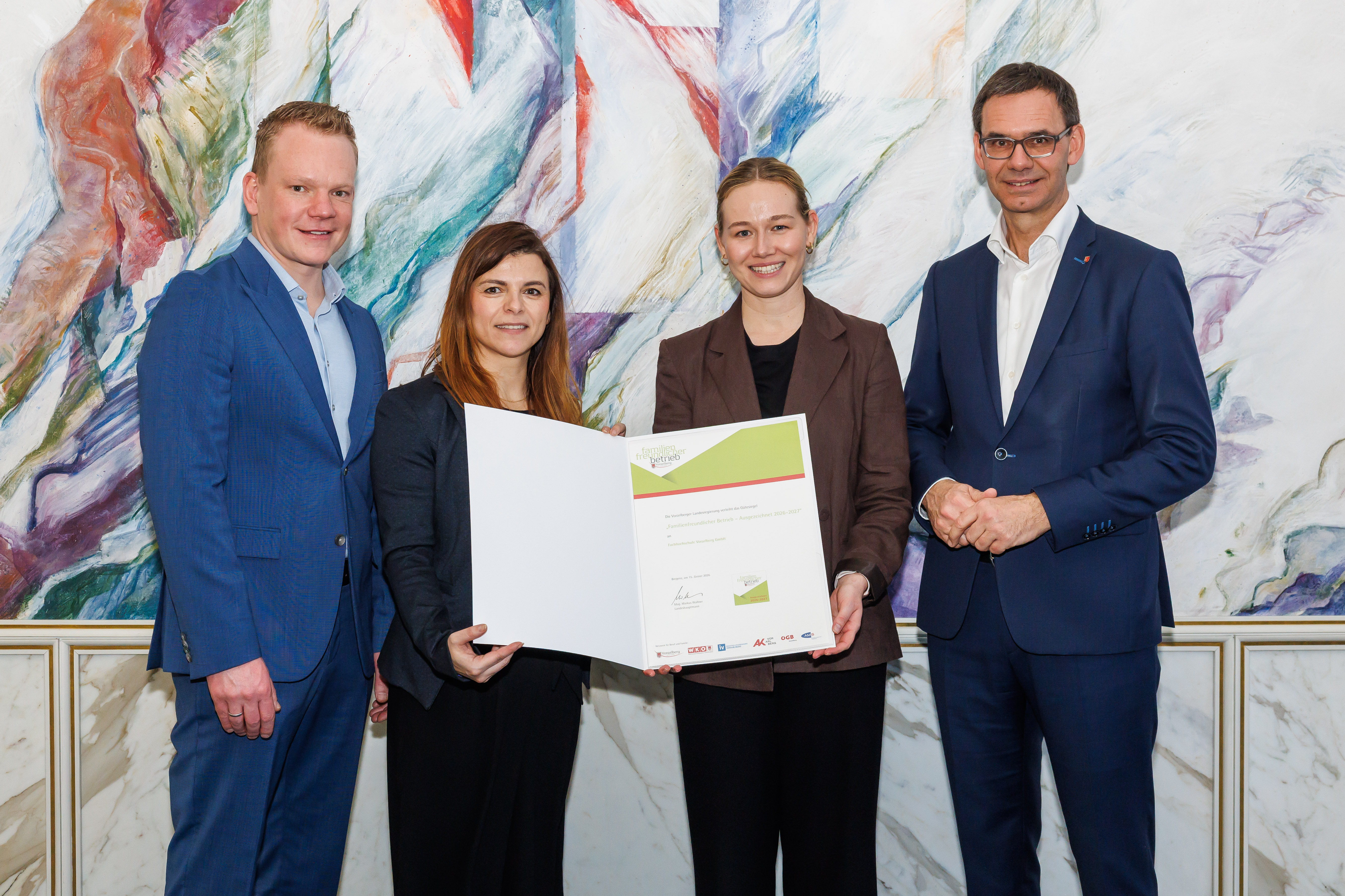 „Wir sind stolz, dass die FHV zum sechsten Mal als familienfreundlicher Betrieb ausgezeichnet wurde. Diese Anerkennung bestätigt unseren kontinuierlichen Einsatz für die Vereinbarkeit von Beruf und familiären Verpflichtungen“, so Isabella Maier-Venc, Teamleiterin Recruiting & Personalentwicklung. Sie nahm das Gütesiegel gemeinsam mit ihrer Kollegin Freya Rickenbacher von Landeshauptmann Markus Wallner entgegen. Insgesamt erhielten 161 Betriebe und Institutionen aus allen Landesteilen das begehrte Zertifikat.