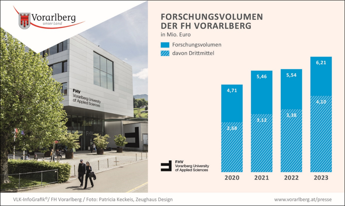 Die FHV ist im Verhältnis des Forschungsvolumens zur Zahl der Studierenden, aber auch qualitativ eine der forschungsstärksten Fachhochschulen Österreichs und ein Innovationsmotor für die Region. Als relativ kleine Fachhochschule punktet sie trotzdem bei den großen Programmen. Sie betreibt zwei von 16 laufenden Josef-Ressel Zentren und hat in der letzten Ausschreibung drei von 13 COIN Projekten gewonnen und dabei 2,3 Millionen Euro – das sind über 25 Prozent der zur Verfügung stehenden Bundesförderungen – lukriert.