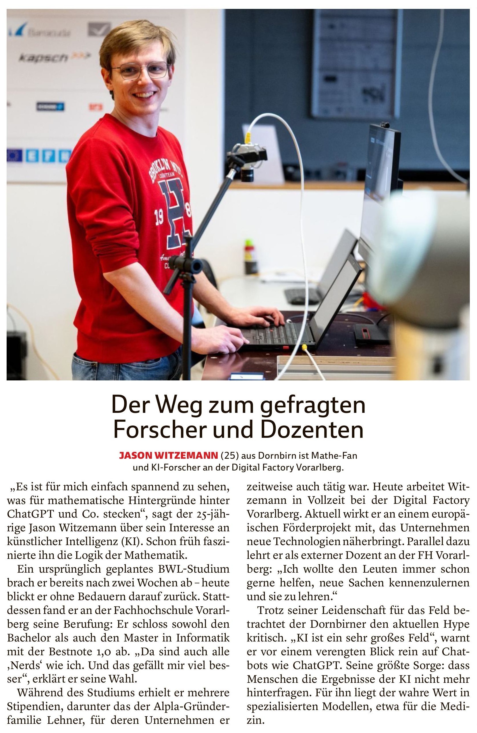 Jason Witzemann aus Dornbirn ist Absolvent der HTL für Wirtschaftsingenieurwesen - Betriebsinformatik in Dornbirn und hat die Bachelor- und Master-Informatikstudiengänge an der FHV absolviert. Er verkörpert akademische Exzellenz, Innovationskraft und gesellschaftliches Engagement. Als Jahrgangsbester mit einem Notendurchschnitt von 1,0 und einer Bachelorarbeit über Quantencomputer hat er nicht nur technologische Grenzen ausgelotet, sondern auch seine Leidenschaft für Künstliche Intelligenz im Masterstudium weiter vertieft, auch dieses Studium hat er im September 2025 mit Auszeichnung abgeschlossen. Beruflich gestaltet er die digitale Transformation in der Digital Factory Vorarlberg, einer Tocherfirma der FHV, aktiv mit und übernimmt Verantwortung in komplexen Projekten. Er ist auch bereits seit mehreren Semestern als externer Lehrbeauftragter an der Fachhochschule tätig und teilt sein Wissen mit der nächsten Generation von Studierenden. Das hat ihn auch im Studium ausgezeichnet, bei schwierigen Themen stand er für seine Kolleg:innen zur Verfügung und hat selbstorganisierte Lerngruppen geleitet. Ausgezeichnet für seine Leistungen wurde er neben den jährlichen Leistungsstipendien mit dem Christl- und Horst Zimmermann Förderpreis und dem Alpla Stipendium. Jason verbindet Wissen, Praxis und Vision. Damit ist er ein Impulsgeber für die Zukunft, von dem wir uns einen wesentlichen Beitrag für die Region erwarten.