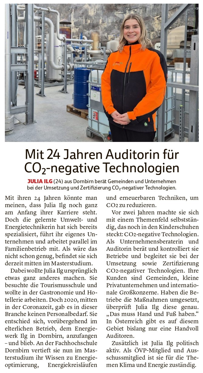Julia Ilg aus Dornbirn überzeugte bereits während des Bachelorstudiums Umwelt & Technik mit hervorragenden Prüfungsleistungen. Sie war während des Vollzeitstudiums außerdem berufstätig und konnte dieses dennoch mit einem beeindruckendem Notenschnitt von 1,8 abschließen. Als Unternehmerin strahlt Julia Führungskompetenz aus und trägt im Familienunternehmen aktiv zur Lösung von Fragestellungen der Energiezukunft Vorarlbergs bei. Julia beschäftigt sich in und außerhalb ihres Studiums mit innovativen und äußerst zukunftsrelevanten Themen im Bereich Energie und konnte durch die intensive Auseinandersetzung mit dem Thema Klimabeton bereits Fortschritte in Sachen Nachhaltigkeit erzielen. Durch ihre offene Art und ihr breites Interesse an wissenschaftlichen und praxisrelevanten Fragestellungen wird sie als "Kopf von morgen" weiterhin positives in der Region bewirken.