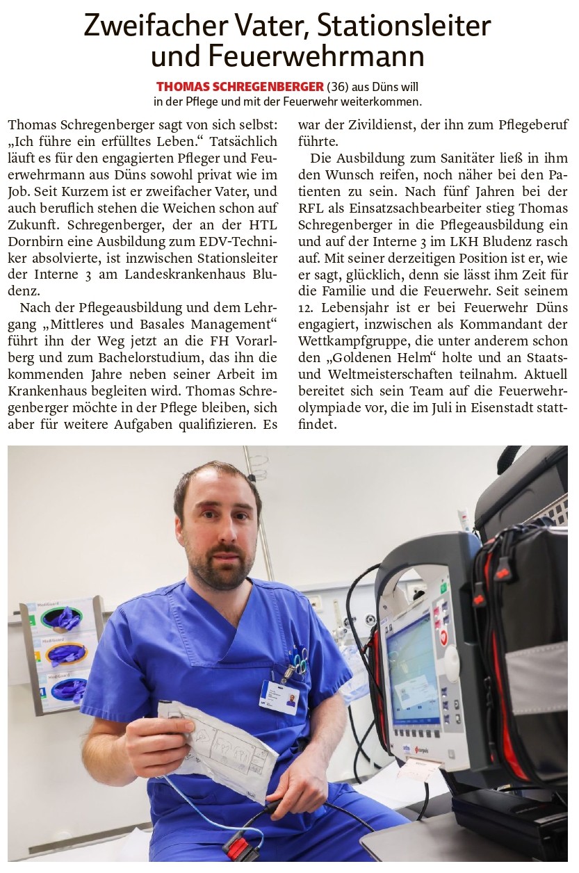 Thomas Schregenberger aus Düns, der an der HTL Dornbirn eine Ausbildung zum EDV-Techniker absolvierte, ist inzwischen Stationsleiter der Interne 3 am Landeskrankenhaus Bludenz. Nach der Pflegeausbildung und dem Lehrgang „Mittleres und Basales Management“ führte ihn der Weg jetzt an die FHV. Hier absolviert er ein berufsbegleitendes Bachelorstudium in Gesundheits- und Krankenpflege, das ihn die kommenden Jahre neben seiner Arbeit im Krankenhaus begleiten wird. Durch das Studium will er sich für weitere Aufgaben qualifizieren. Er ist engagierter Pfleger, zweifacher Vater und passionierter Feuerwehrmann.