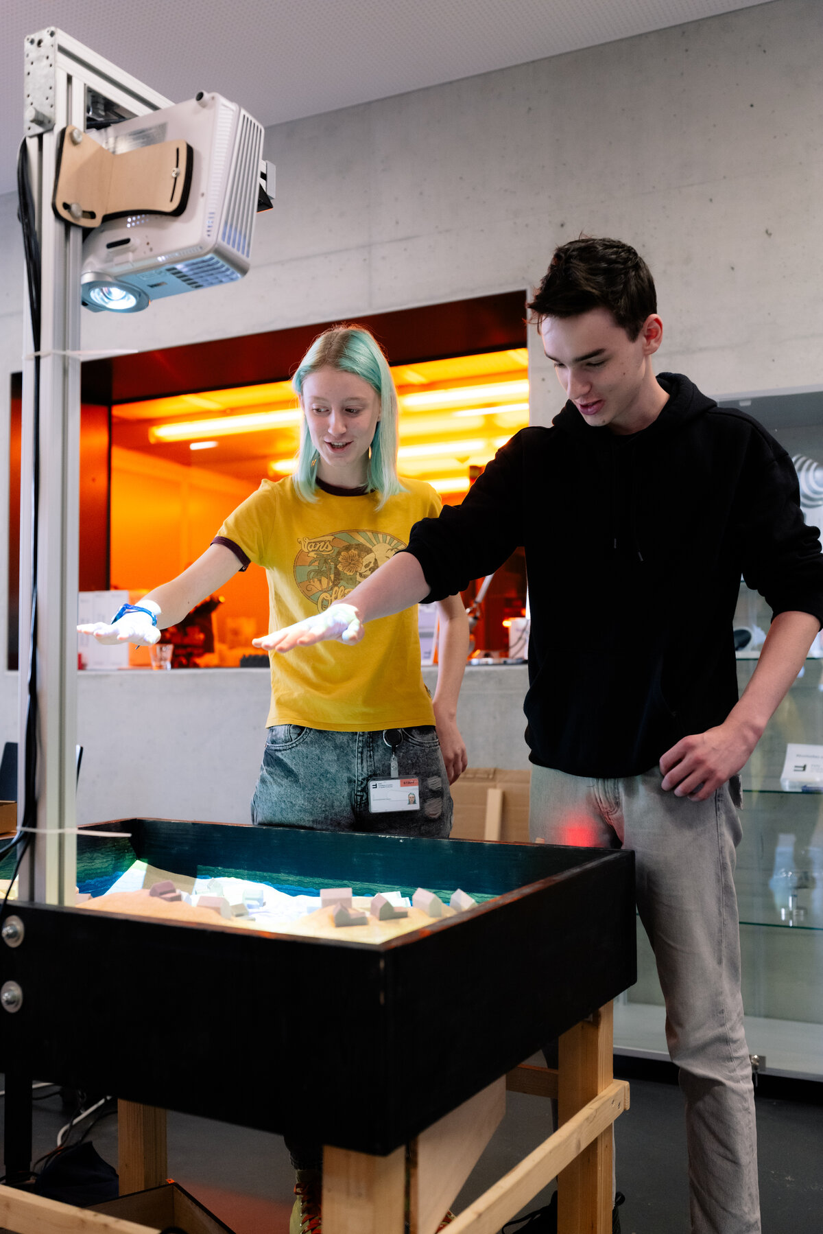 Versuchsanordnung: Fabrizia und Maximilian lassen es regen. Was auf den ersten Blick wie Magie anmutet, hat einen handfesten Untergrund. Die Schüler:innen bereiteten eine hölzerne Box vor, befüllt sie mit echtem Sand und projizierten mithilfe einer Augmented Reality (AR)-Software in Echtzeit Höhenschichtlinien auf diesen Sand. Durch das händische Formen des Sandes erzeugten Fabrizia und Maximilian Landschaften mit Bergen, Tälern und Seen. Zudem erstellten sie 3D-gedruckte Häuser und Staumauern. Die Open Source AR-Software erkennt eine in die Höhe gehaltene Hand als Regenwolke und lässt es an genau dieser Stelle regnen. Das Fließen des Wassers wird auf dem Sand projiziert.