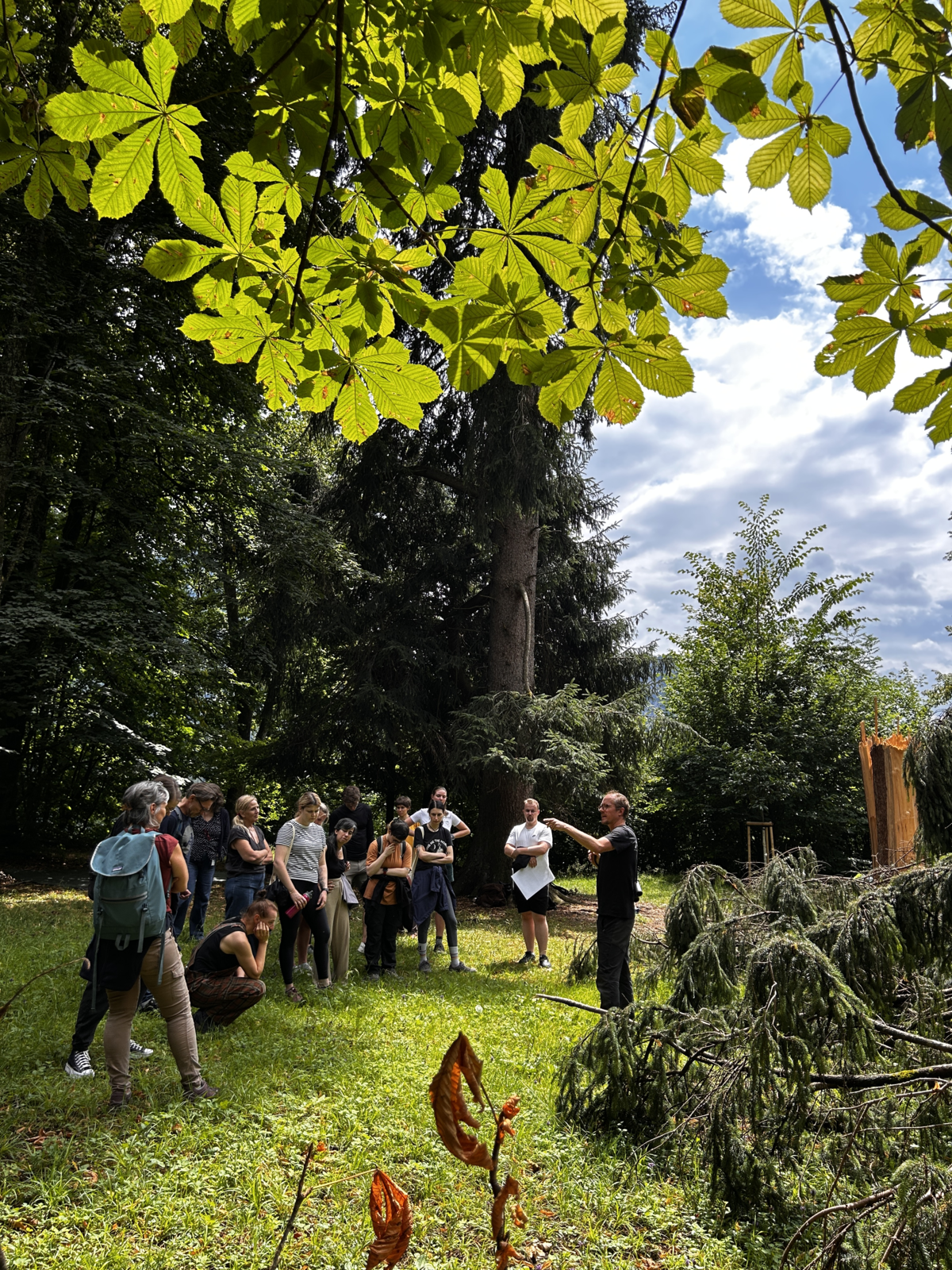 Genauso vielfältig wie die Natur Vorarlbergs war auch das Programm. Zum Start in die Woche richtete Margarita Köhl, Leiterin des Fachbereichs Gestaltung, mit ihrem Impuls „More-Than-Human Design“ den Blick auf Designperspektiven, die nicht nur den Menschen, sondern vor allem den Planeten in den Mittelpunkt stellen. Mit diesem Mindset ging es dann erstmal nach draußen, denn der Auftrag war klar: Wie können wir von der Natur lernen? Lukas Rinnhofer, externer Dozent an der FHV, Naturführer und Experte für heimische Ökosysteme, begleitete die Exkursionen ins Fohramoos, ans Bödele und auch in die inatura. Neben Exkursionen, Feldforschung und theoretischem Wissen, blieb vor allem viel Raum für kreatives Gestalten, Austausch und gemeinsame Erfahrungen.
