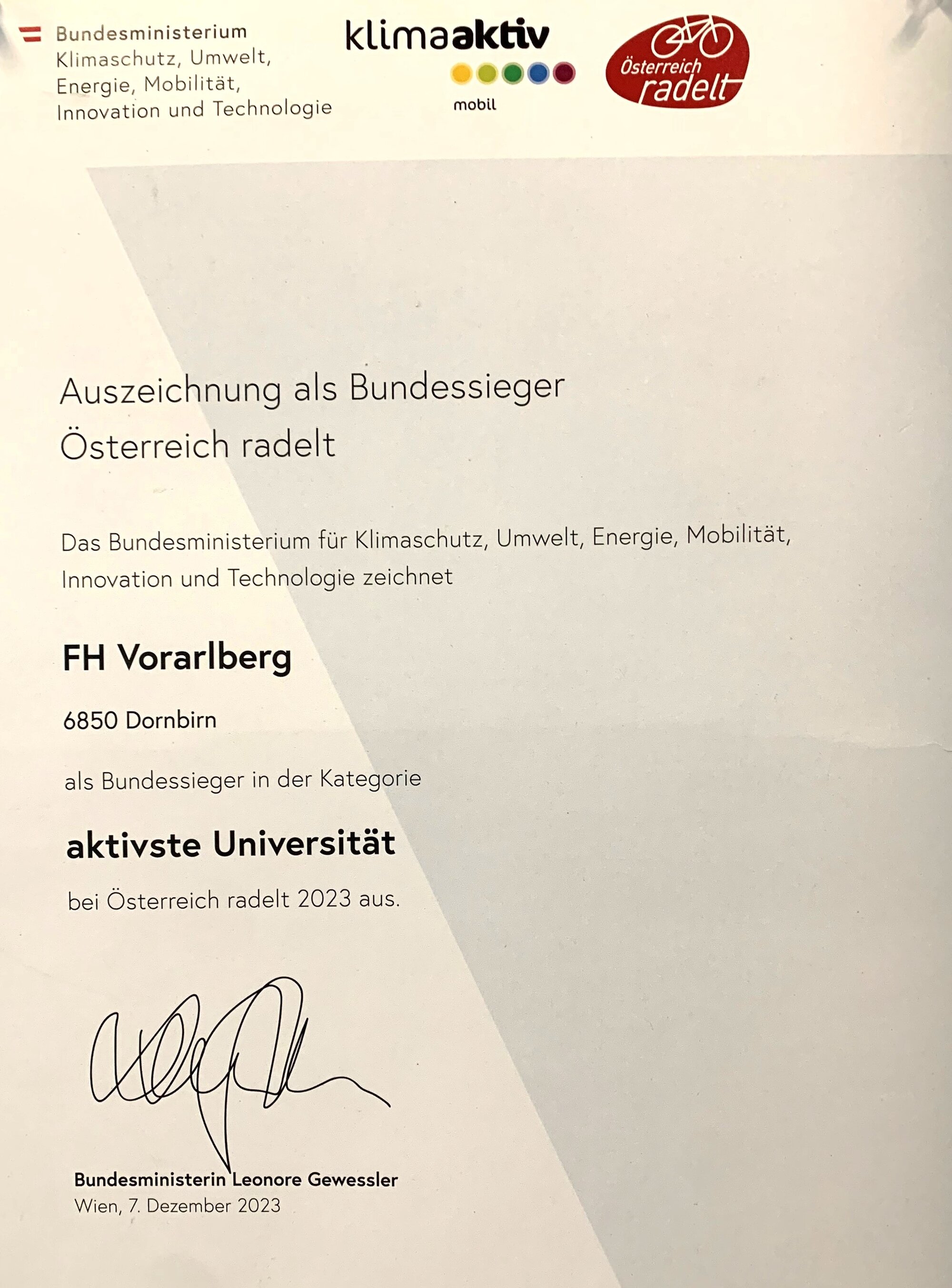 20.03.2024Seit 20. März sammeln die Vorarlberger:innen wieder fleißig Kilometer auf dem Rad – und somit auch die Mitarbeitenden der FHV. Der Wettbewerb „Österreich radelt“ läuft bis 30. September, Anmeldungen sind ab sofort möglich. Es gibt zahlreiche attraktive Preise zu gewinnen. Im Rahmen der Aktion hat die FHV im Ranking der österreichischen Hochschulen im Jahr 2023 den ersten Platz belegt und kürte sich damit zur Bundessiegerin.