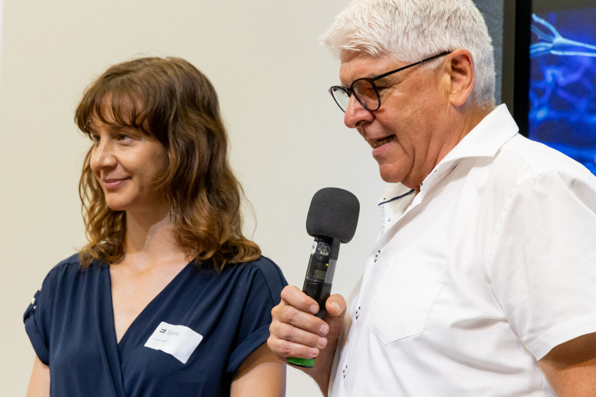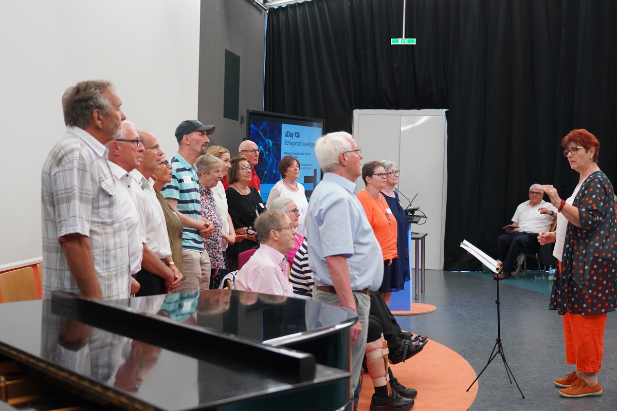 Standing Ovations bekamen die Sänger:innen vom Aphasiker Chor Ostschweiz mit ihrer Leiterin Karin Anderecke und der Dirigentin Kathrin Pfändler. Sehr bewegend und eindrücklich, wie Schlaganfallüberlebende mit massiven Sprachproblemen, der sogenannten Aphasie, eine ganze Aula zum Mitsingen und Lachen bringen konnten. Die ersten Gespräche zur Gründung eines Aphasiker Chores in Vorarlberg wurden bereits in den Pausen im Garten der FHV geführt – mit Unterstützung aus der Ostschweiz.