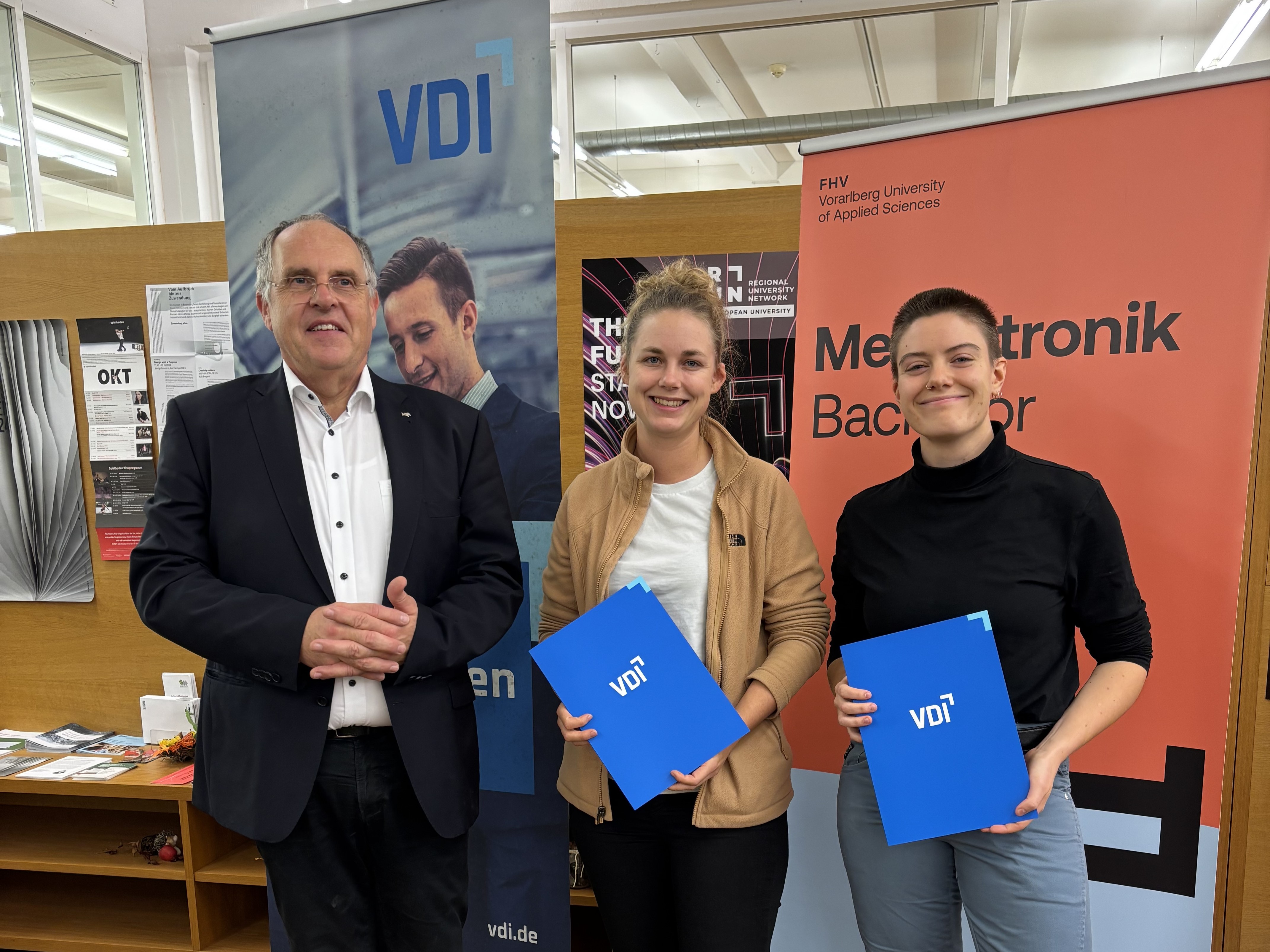 05.11.2024Prof. Dr. Harald Ludanek gratulierte den beiden Preisträgerinnen im Namen von VDI Bodensee. Karla Tschavoll (Absolventin Bachelor Elektrotechnik und Informationstechnologie Dual) bearbeitete ein parametrisierbares und kompilierbares Simulationsprogramm in MATLAB. Sie ist aktuell in einem Forschungsteam bei Airbus beschäftigt. „Karla hat durch ihr Engagement und ihre stetige Weiterentwicklung gezeigt, dass sie diese Anerkennung verdient. Mit dieser anspruchsvollen Arbeit hat sie ihre Fähigkeit unter Beweis gestellt, komplexe technische Fragestellungen zu bearbeiten und innovative Lösungen zu entwickeln. Weiters ist sie durch ihr Engagement im Rahmen von Lehrprojekten ein Vorbild für andere Studierende“, gratulierte Studiengangsleiter Franz Geiger.