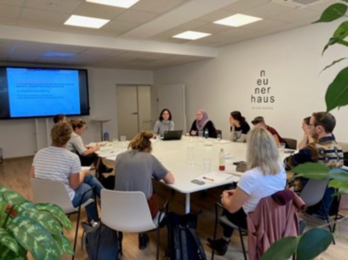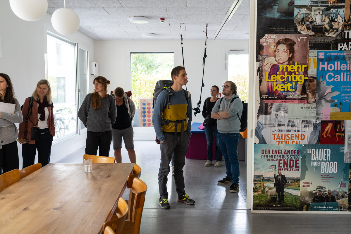 Zum Abschluss führte die Exkursion in das Nordbahnviertel im zweiten Wiener Gemeindebezirk. Das Wohnprojekt Kohlenrutsche, ein freistehendes Haus mit 33 Wohnungen und vielen Gemeinschaftsräume, lud ein, in die Welt des gemeinschaftlichen Wohnens einzutauchen. Auf den ersten Blick scheint die Zielgruppe dieses Wohnprojekts des Vereins Andres Wohnen, im Kontrast zu den Begegnungen und Menschen der letzten Tage zu stehen. Doch auf einen zweiten Blick wird klar, dass auch hier soziale Zielsetzungen eine Rolle spielen.