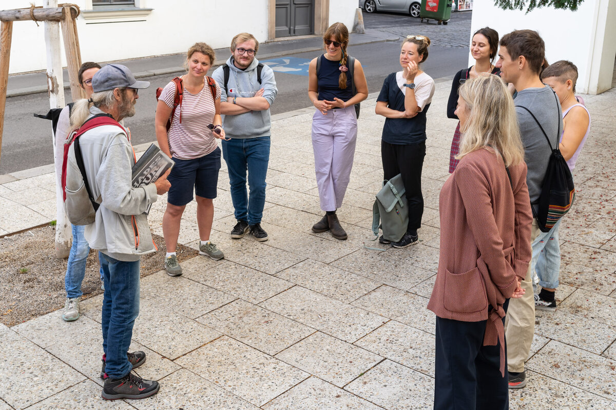 Auch der Verein VinziRast versucht mit unterschiedlichen Projekten, die Lebenssituation Obdachloser nachhaltig zu verbessern. So führte der nächste Programmpunkt die Studierenden in den neunten Bezirk zu „VinziRast-mittendrin“ und einem Gespräch mit Obfrau Veronika Kerres. Im Mittelpunt steht hier das Miteinander in Form von begleitetem Wohnen. So gibt es unter anderem elf WGs mit zwei bis drei Plätzen, welche sich aus mindestens einer obdachlosen Person und eine/r Student:in zusammensetzen.
