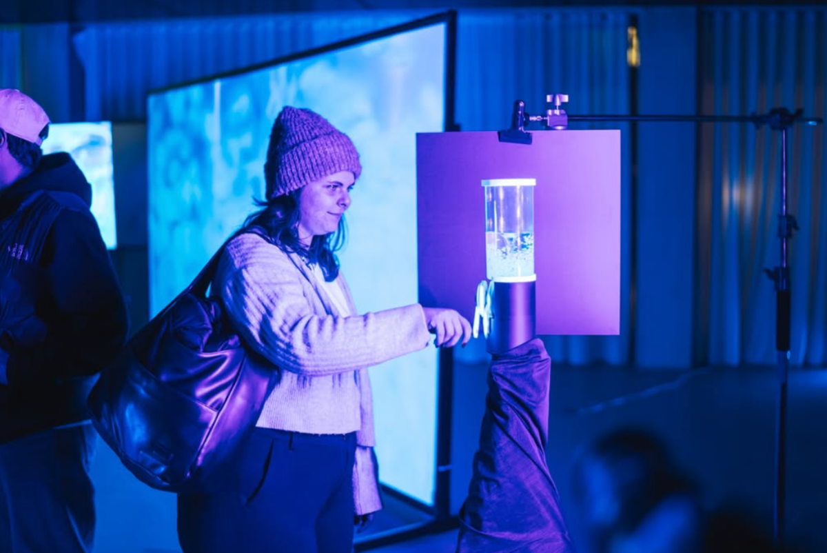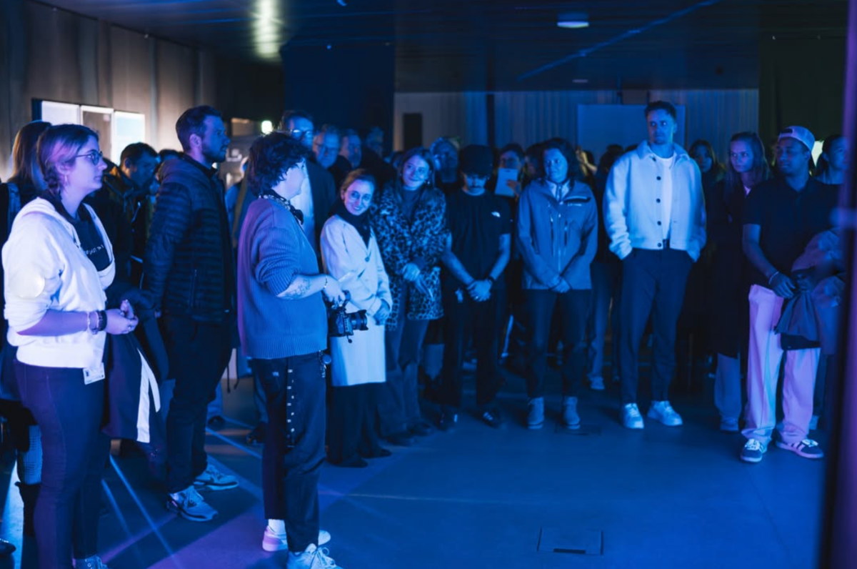 Weiße Stoffbahnen, die wie eine Bergformation drapiert auf einem Gerüst angebracht sind und sich wellenartig bewegen - „50 Hertz“ ist der Titel der Installation, die beim Betreten des Experience Space sofort ins Auge sticht. Es geht weiter mit einer Projektion am Boden, bei der Besuchende Teil eines lebenden Netzwerks werden. „Wir haben in diesem Sprint wirklich den gesamten Designprozess durchlaufen, von der Idee über das Modell bis zur Umsetzung. Es war herausfordernd, aber unglaublich spannend und lehrreich!“, so die Studierende Diana Marte.